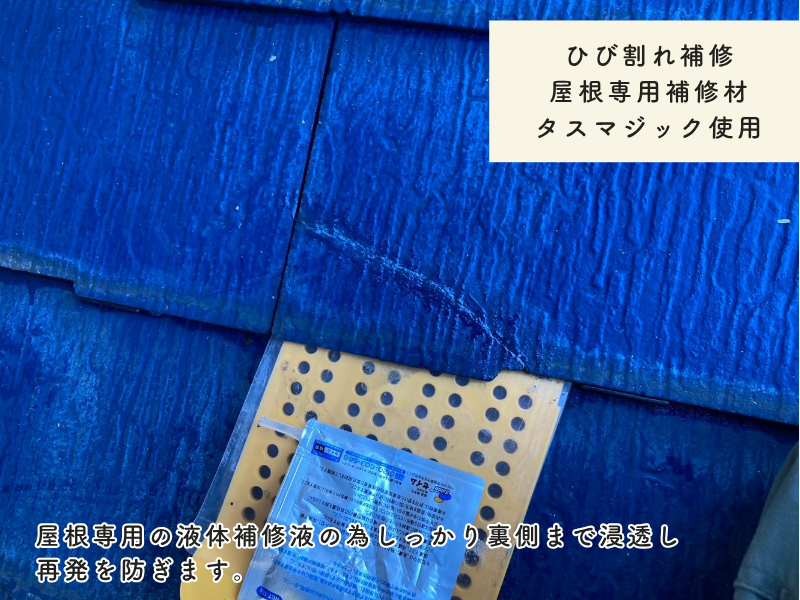 ひび割れにはタスマジックという屋根専用の補修材を使用します。タスマジックは浸透型の補修液なので、表面だけではなく裏側まで接着させることでより耐久性をUPします。そして屋根材の間に水の抜け道を確保するための「タスペーサー」を挿入。