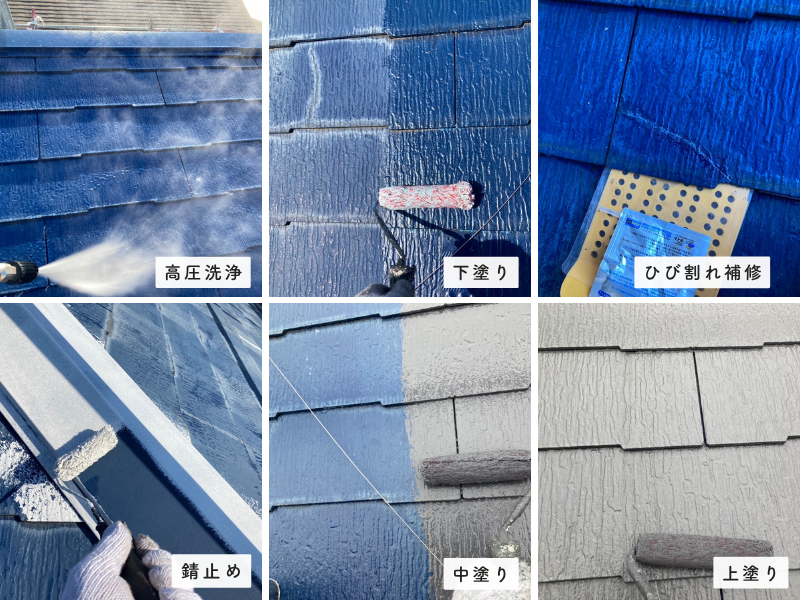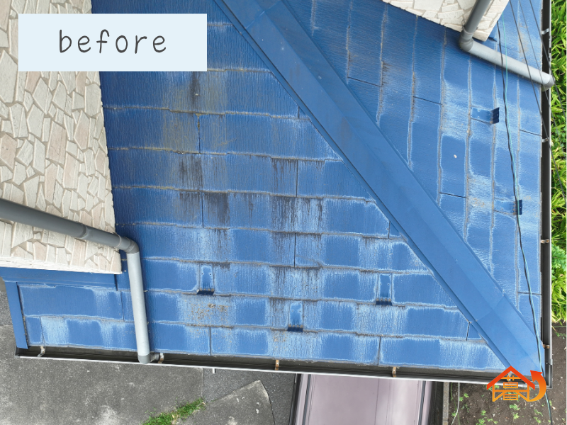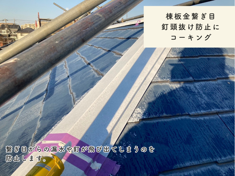 外壁に比べ、屋根は雨や紫外線の影響を一番受けるところなので今回のメンテナンスでしっかり補修していきます。今回は板金釘浮き、ひび割れが数か所見受けられましたので補修し作業していきます。屋根塗装