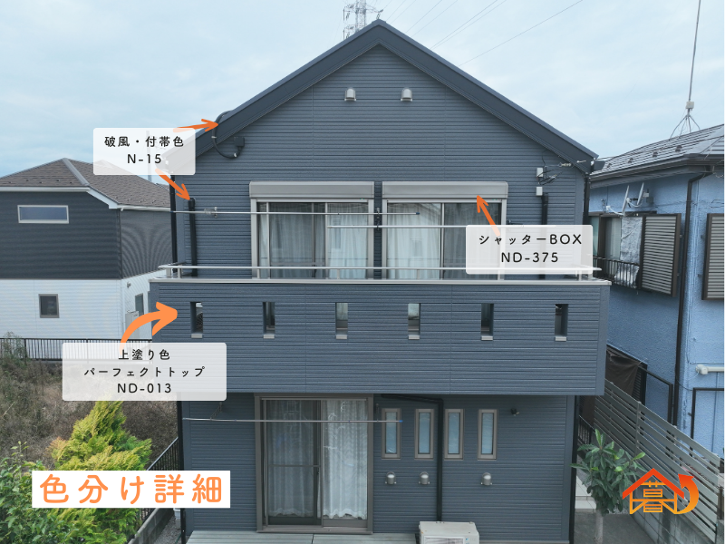 外壁の塗装には日本ペイントのパーフェクトトップ、色はND-013を採用しました。
