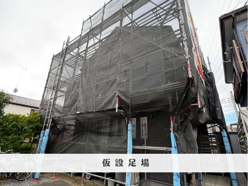 T様邸では、深刻な劣化は見られませんでしたが面によっては苔が多く発生していたので、メンテナンス時期としてはとても良いタイミングだったかと思われます。足場の組み立て