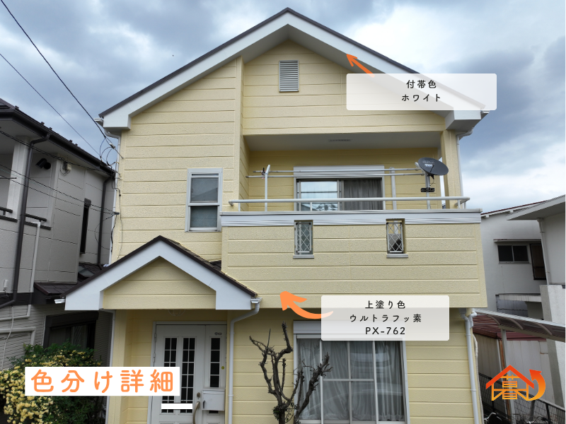 付帯色にはホワイトを使用しました。外壁の塗料にはプレマテックスのウルトラフッ素を採用しました。