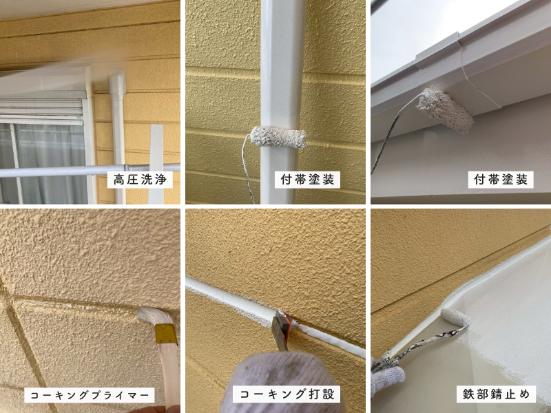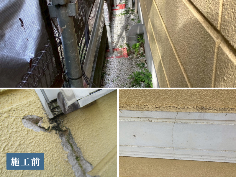 実際にお時間をいただいて建物の調査をしました。塗膜の劣化やコーキングの劣化、塗装をする前にしっかり下地補修を行うことが大切になってきます。現地調査の他に足場の組み立て後にも同じように調査をします。